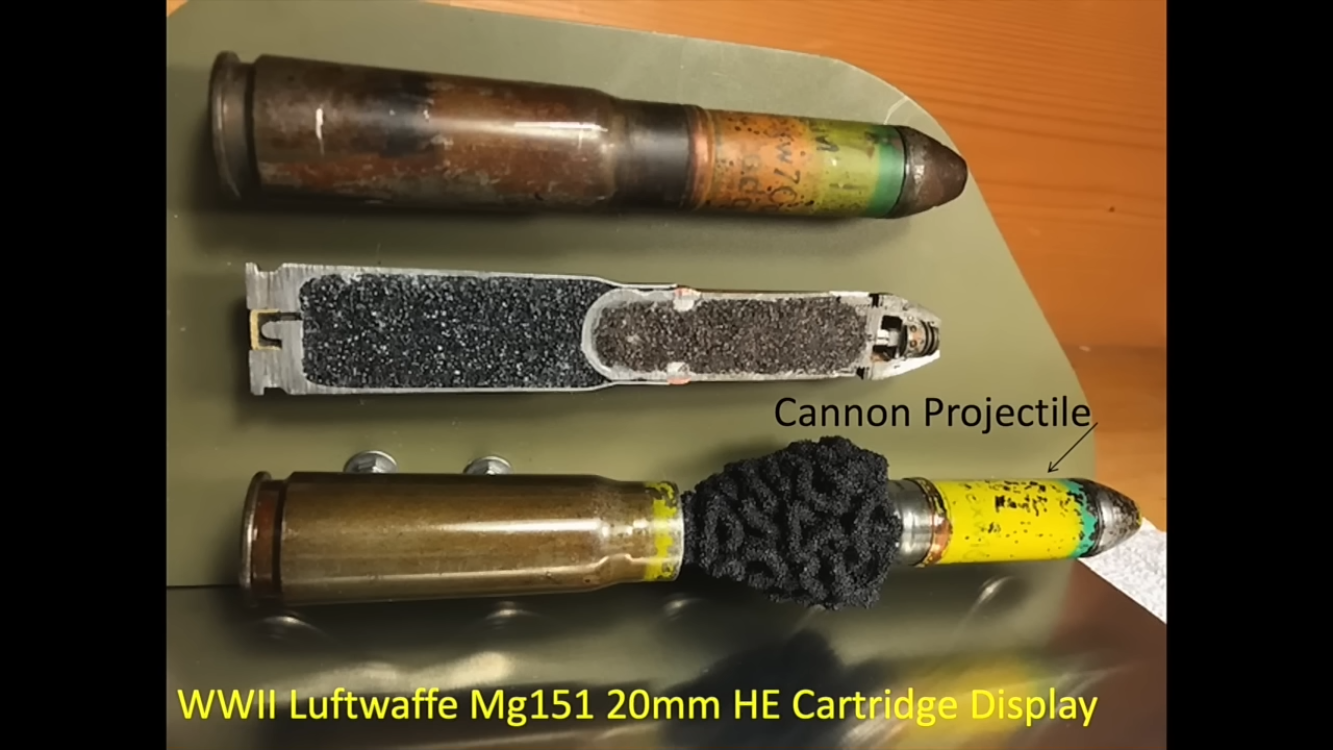 The MG 151 fired a high explosive mine projectile rather than an armor-piercing slug. The round contained about eighteen grams of explosive inside a hollow steel body and used a nose fuse that detonated after brief delay on contact.