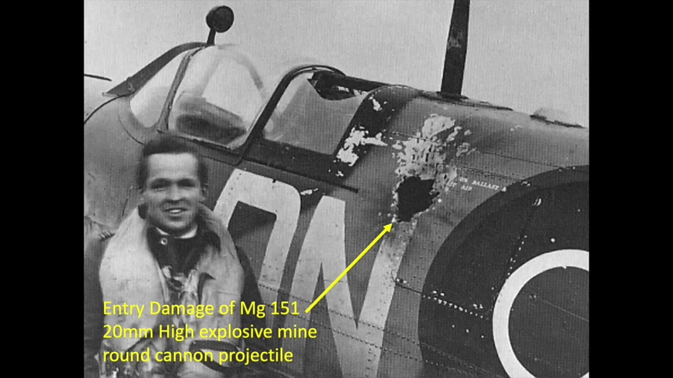 Photographs and gun-camera film show characteristic entry holes with powder burns and exit-side fragment punctures. Surviving airframes display clustered splinter damage around detonation sites.