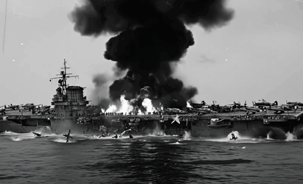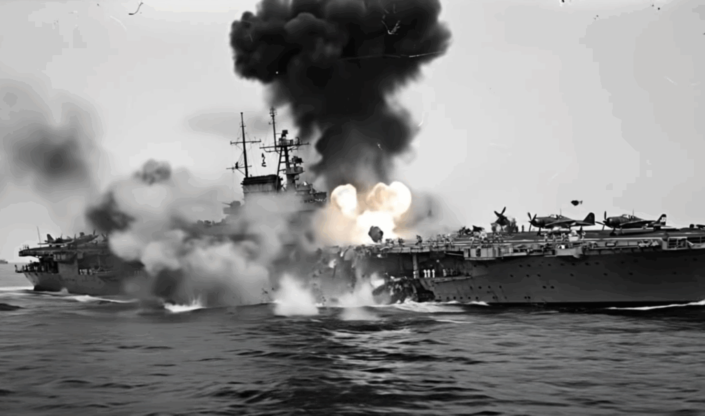 While the skies were filled with dogfights, American submarines waited below. The USS Albacore sighted Ozawa’s flagship, the carrier Taiho, and fired torpedoes that struck deep in her hull. At first, her crew thought she could be saved, but leaking gasoline fumes ignited hours later, causing a massive explosion that sank her. Around the same time, the USS Cavalla attacked Shokaku, scoring three torpedo hits. The great carrier erupted in flames and sank with over a thousand men aboard.