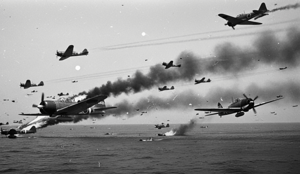 The result was disastrous for Japan. Hellcats tore through the incoming formations with deadly precision. American pilots later described the scene as a “turkey shoot.” Zeros and dive bombers burst into flames, spiraling into the sea. Only a handful broke through to attack the carriers, causing little damage. By midday, nearly 250 Japanese planes had been destroyed. In one day, Japan’s air superiority vanished.