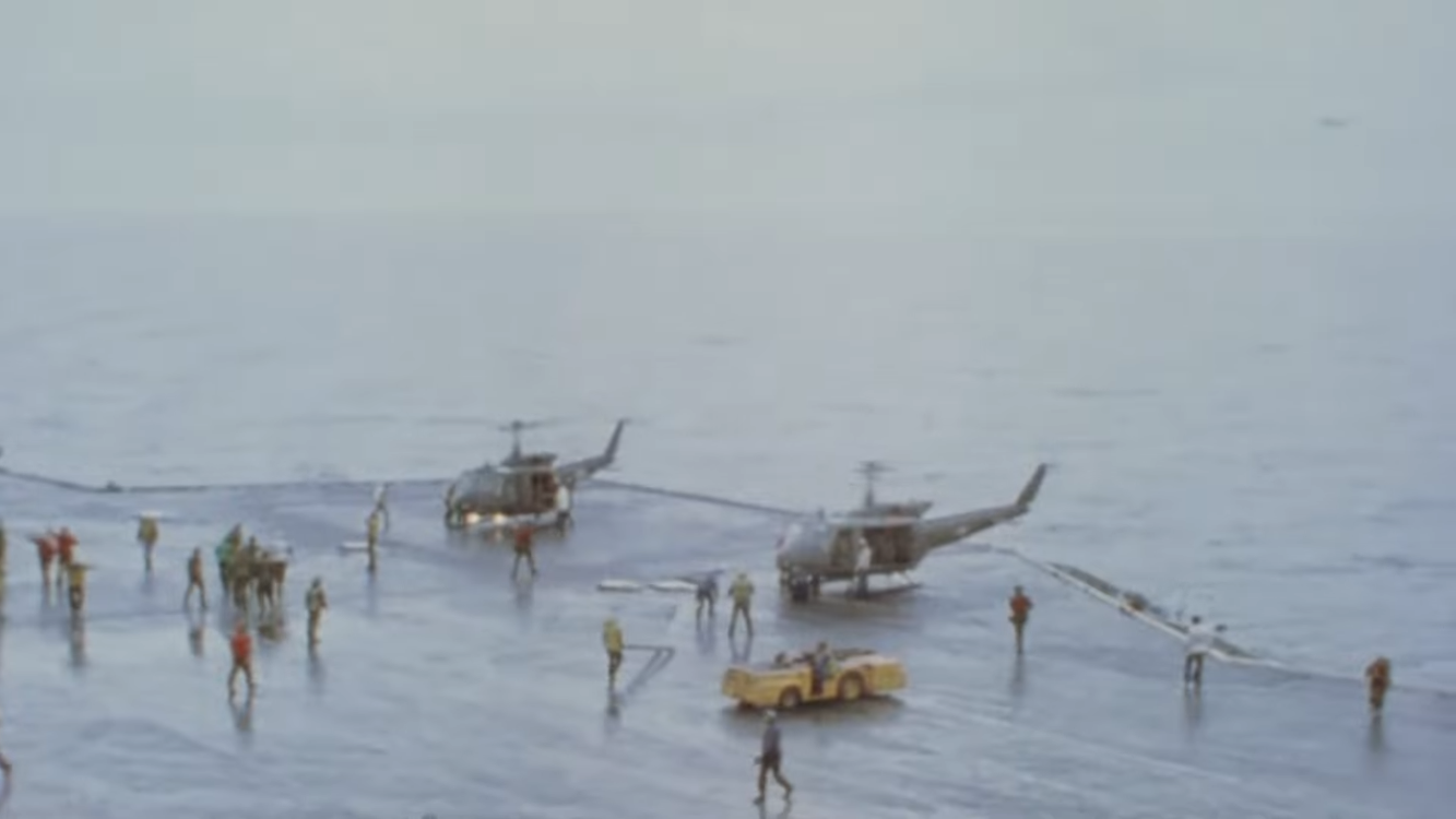 Clearing the deck required drastic action. The crew pushed three empty Hueys and one Chinook into the sea. Five more helicopters landed, unloaded their passengers, and were thrown overboard as well. Captain Chambers believed that he might face a court martial for the loss of equipment, but he continued clearing the deck.