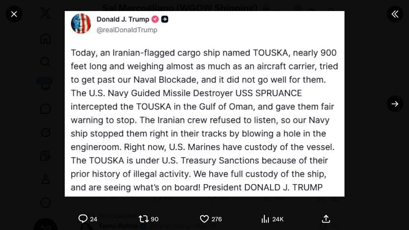 Unlike 1988, the strategic effect appears more contained. While Operation Praying Mantis led to a reduction in Iranian attacks on shipping, the Touska incident has not produced a similar shift. Iranian authorities have condemned the seizure and called for the ship’s return.