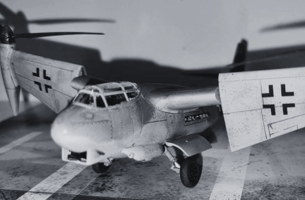 Weserflug engineers proposed a design with rotor arms that could tilt forward after takeoff. In helicopter mode, the rotors would lift the aircraft. Once airborne, the arms would rotate forward and the jet boosters would engage, turning the aircraft into a high-speed machine. No aircraft in the world at the time attempted such a transition, and the design pushed far beyond what wartime industry could support.