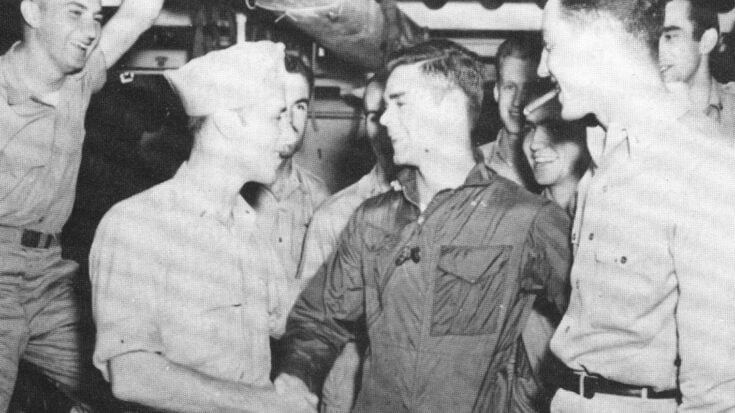 Hobbs opened his canopy and jumped his parachute catching the air. He floated down, but his strength faded before he hit the sea. His body dropped into the water as the battle continued. Afterward, only two Hellcats made it back to the carrier, piloted by Hansen and Proctor, who landed.