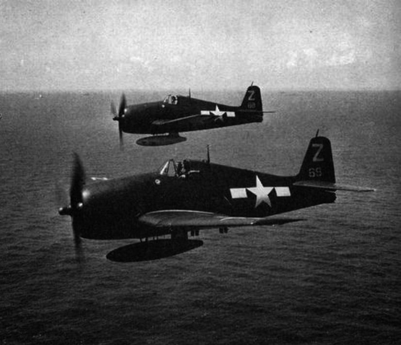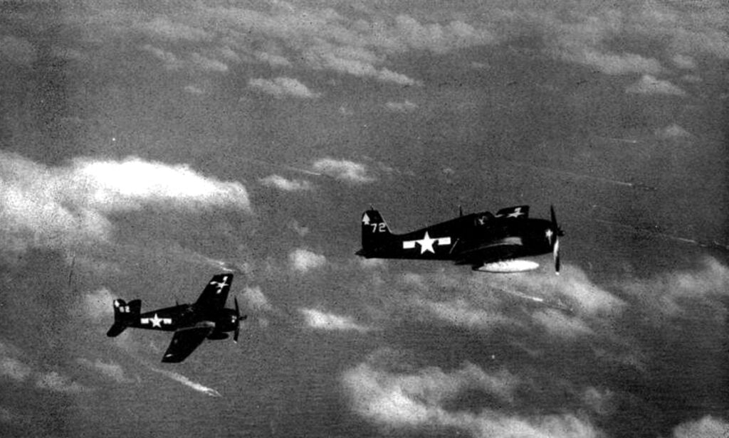 Meanwhile a third team, Lieutenant Joseph Sahloff and Ensign Eugene Mandeberg, were under heavy fire. Their Hellcats shook as rounds struck. Mandeberg’s plane exploded below Sahloff’s view and he watched it fall. Then another enemy aircraft locked onto Sahloff, but help arrived fast from a friend diving down toward safety.