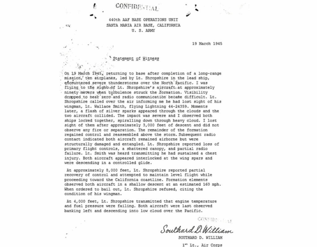 As the formation approached the California coast, a heavy storm pushed in from the west. Visibility dropped sharply, and the aircraft flew into severe turbulence. Shropshire ordered his men to climb in hopes of clearing the worst of the weather. His closest wingman, Lieutenant Wallace Smith, held position only about 50 meters from his right wing, the two having trained together since flight school.