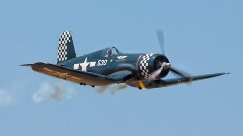 From the first prototype delivered to the U.S. Navy in 1940 to the final aircraft delivered to France in 1953, a total of 12,571 Corsairs were built in 16 different models. This gave the F4U the longest production run of any U.S. piston-engine fighter, lasting from 1942 to 1953. We love that in this demo, there’s no music or narration- just the pure sound of the radial engine and the props cutting through the air!